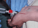 - Træk herefter hele anordningen tilbage til plastik kateteret hurtigt fyldes med blod. Fyldes kateteret meget langsomt, skyldes det fejlplacering i en vene eller at patienten er meget lavtrykket.